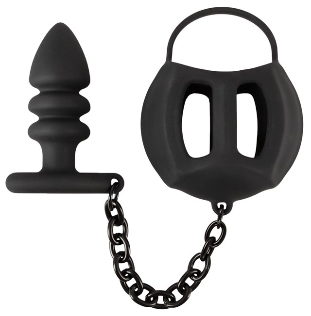 Penisring, pungbur og buttplug er lavet af hudvenlig silikone med en Soft Touch tekstur, der tilpasser sig perfekt til anatomi og bevægelse. Præcis som den fastgjorte robuste metal kæde, der sikrer, at pluggen ikke glider ind.