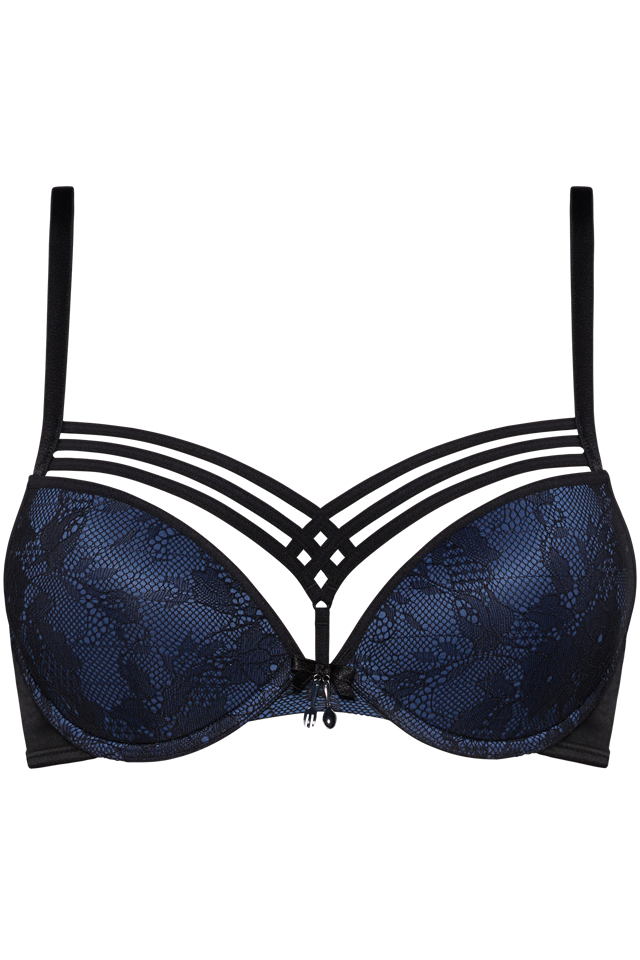 Denne push-up bh, giver dine bryster al den opmærksomhed, som de fortjener. Med en dejlig mørkeblå farve, og sorte blonder, som giver et elegant og sofistikeret look. Polstringen giver ekstra støtte, mens de dekorative stropper, skaber en flot og indbydende barm. A-skålen har ekstra polstring.