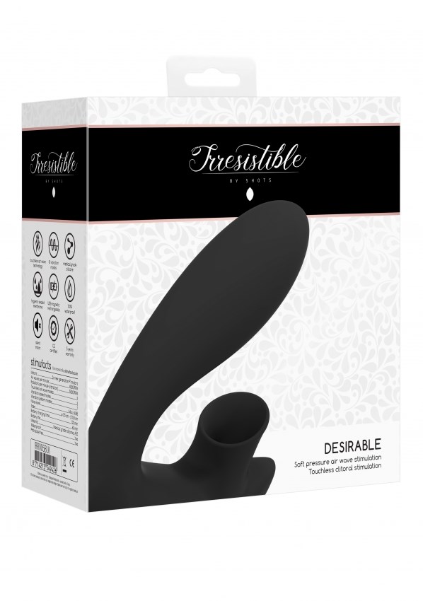 Irresistible Desirable omslutter din klitoris uden at røre ved den og stimulerer den via dejlige trykbølger, der skaber en unik dyb vibration. Vælg mellem 11 forskellige trykbølgeindstillinger! Pulsationerne bevæger sig gennem væv og stimulerer klitoris og producerer de dybeste orgasmer, du nogensinde vil opleve!