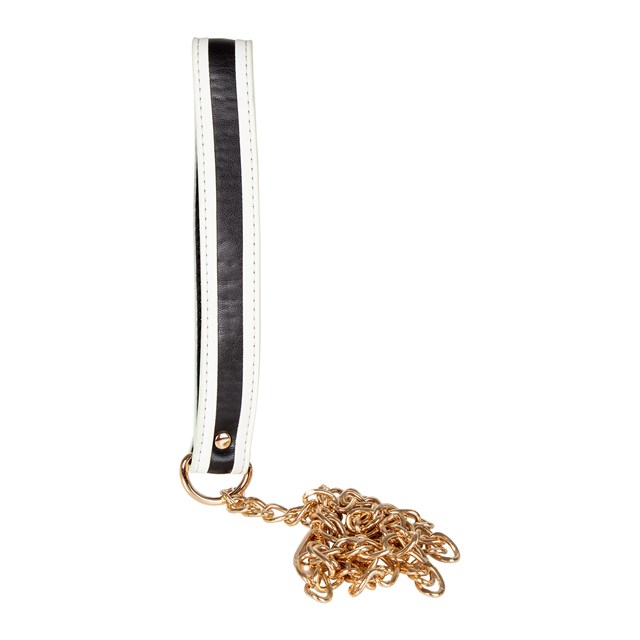 Det hvide kunstlæder i kombination med de gyldne og sorte detaljer gør halsbåndet til et uundværligt stykke legetøj