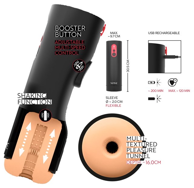 Den kraftfulde Masturbator 08 fra WYNE forkæler penis med en op-og-ned bevægelse og pulserende rystefunktion (7 niveauer). Den har også en booster-knap, der tager masturbatoren fra nul til hundrede på et øjeblik. Øjeblikkelig kraft for intense orgasmer! Alt kan styres via knapperne direkte på legetøjet. Den praktiske LED-skærm gør det nemt at styre de forskellige niveauer.