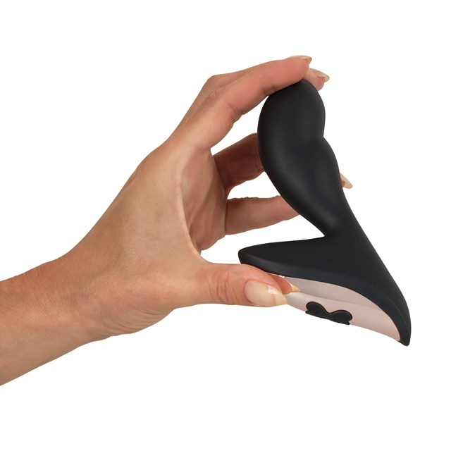 Sort anal vibrator, der giver direkte stimulering på P-stedet, på grund af den buede form.